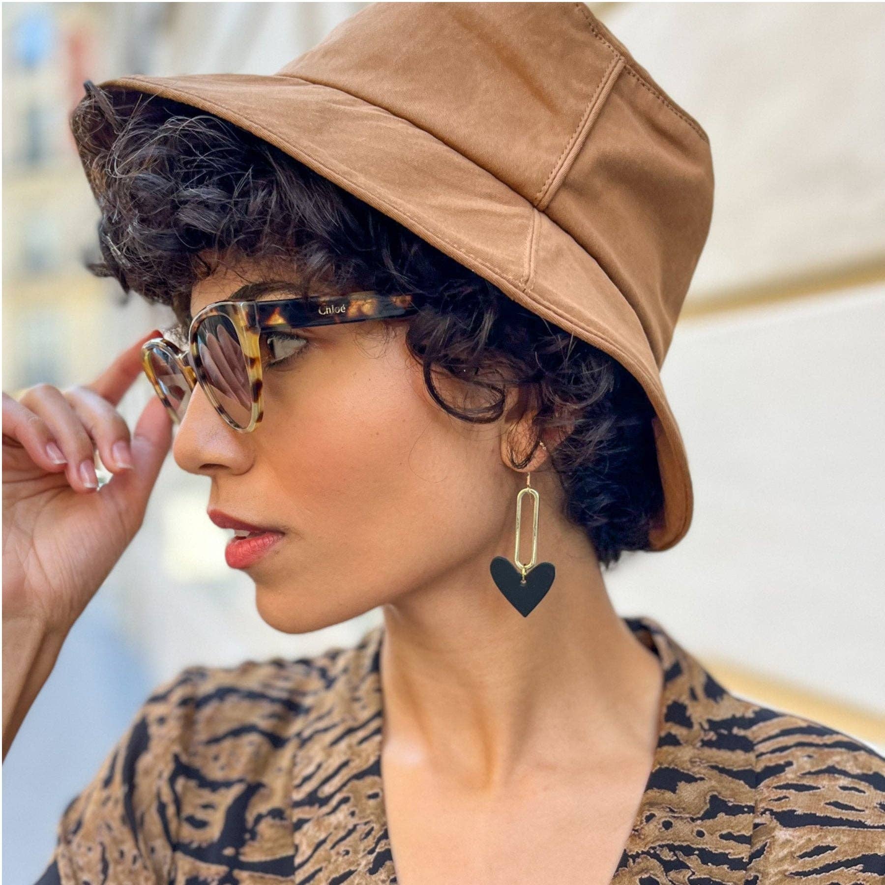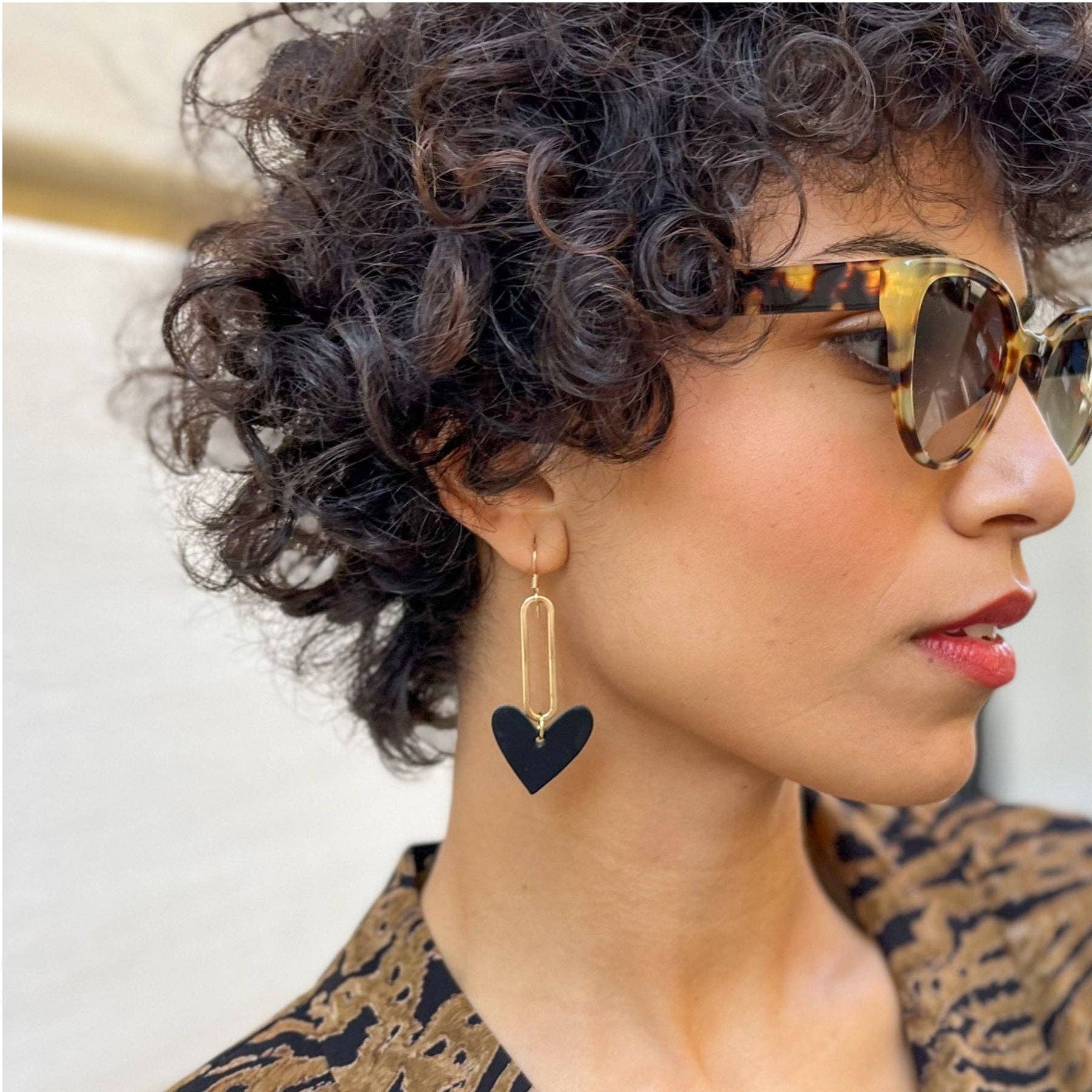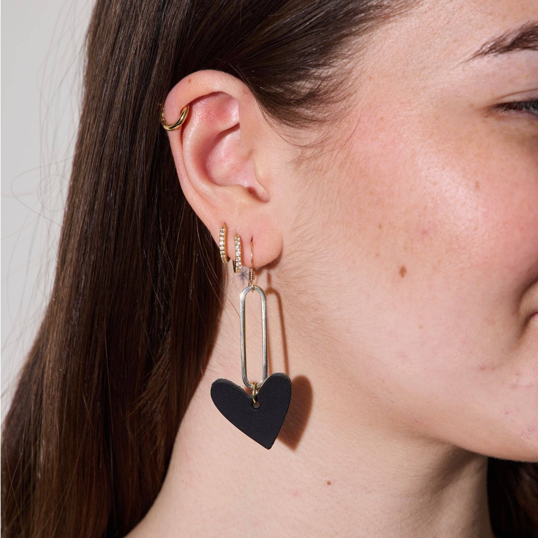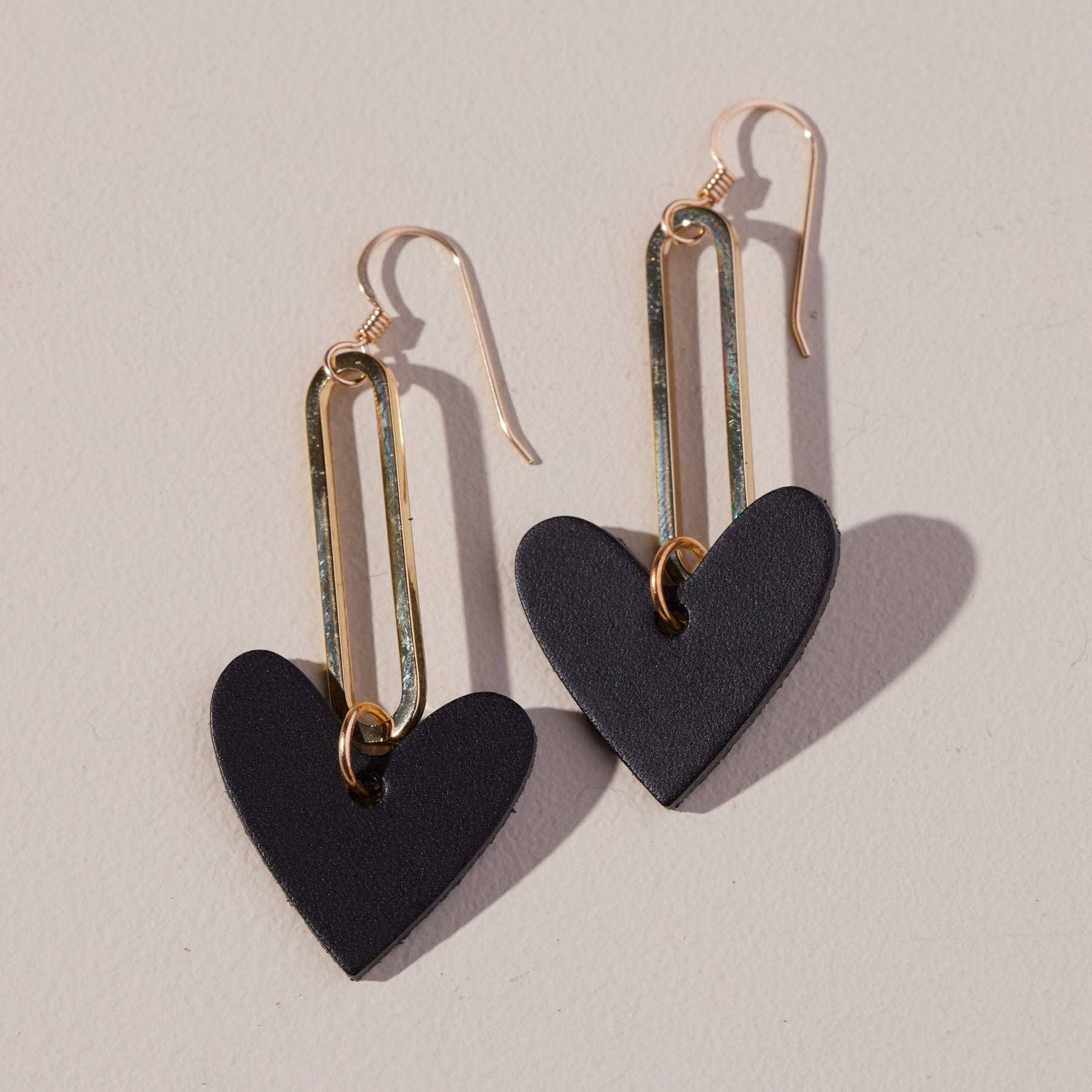Black Milas are drop statement earrings inspired by our patented Sweetheart hoop earring design. These lightweight earrings feature our smooth matte black leather attached to a gold component.