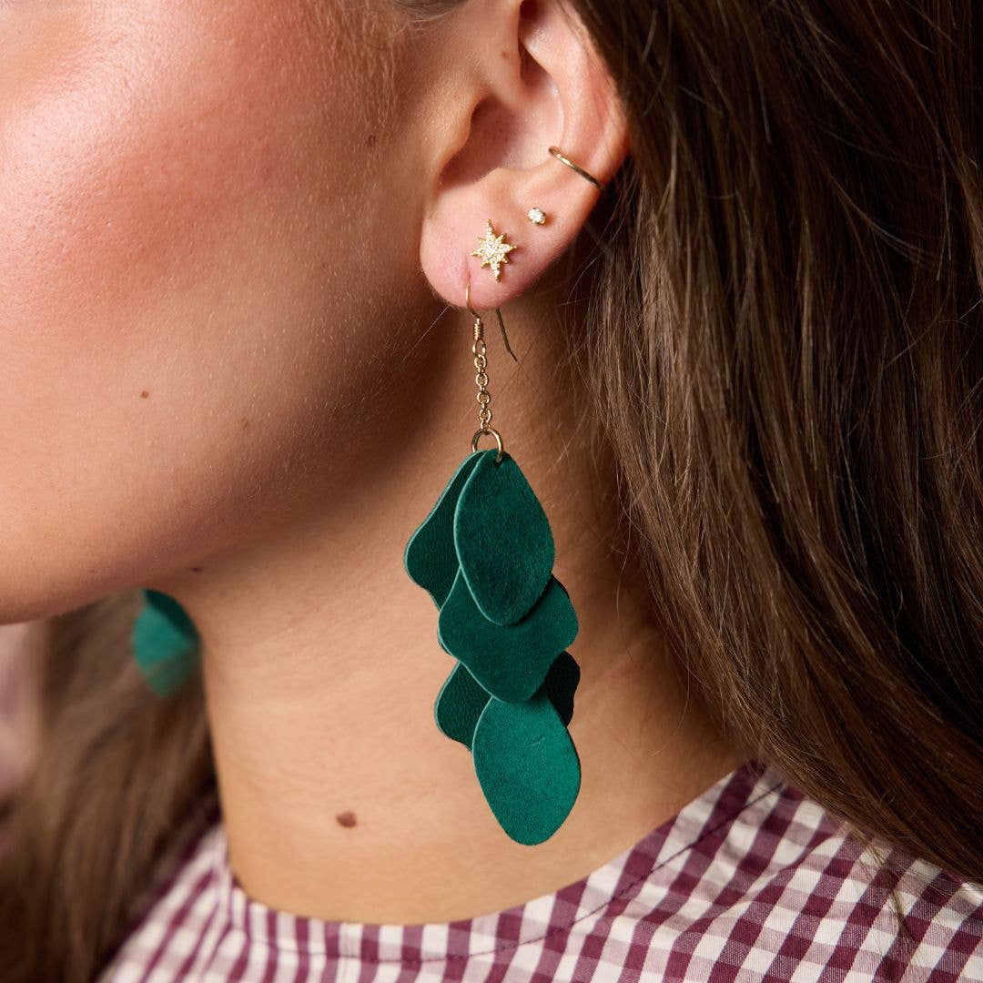 This layered statement earring is designed to be incredibly soft with lots of volume and a subtle sway. Crafted with Mistletoe Suede leather attached to chains, this versatile piece will go with anything.