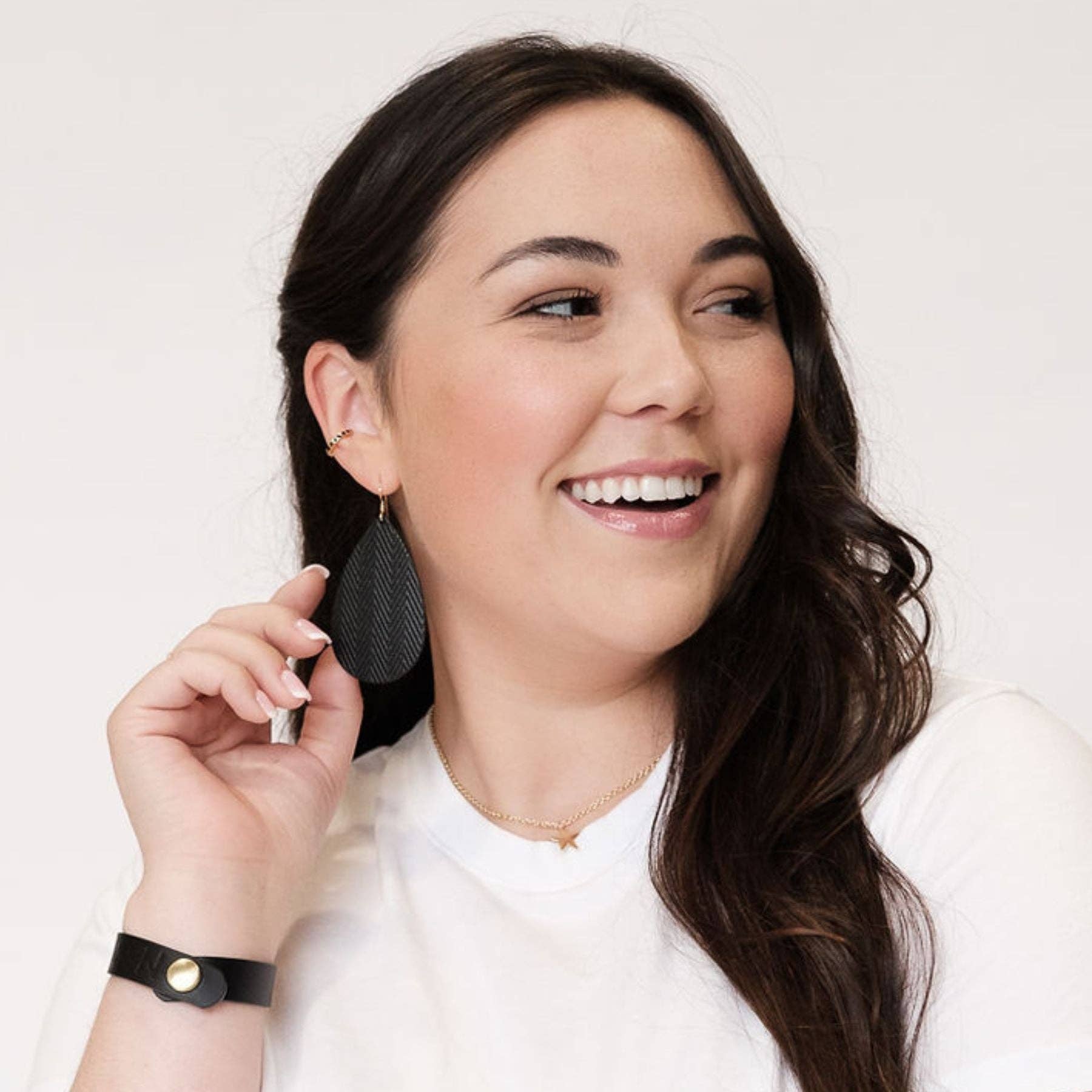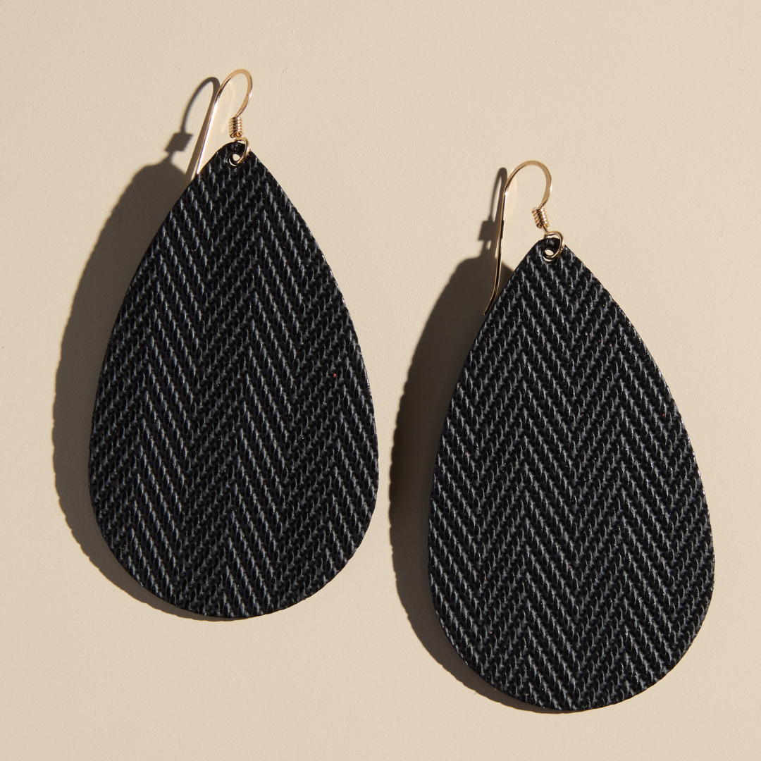 These neutral Teardrop leather earrings are the perfect way to add eye-catching texture and subtle, neutral color to any outfit. This leather earring style is made with our textured black Raven leather, and available on gold hardware.