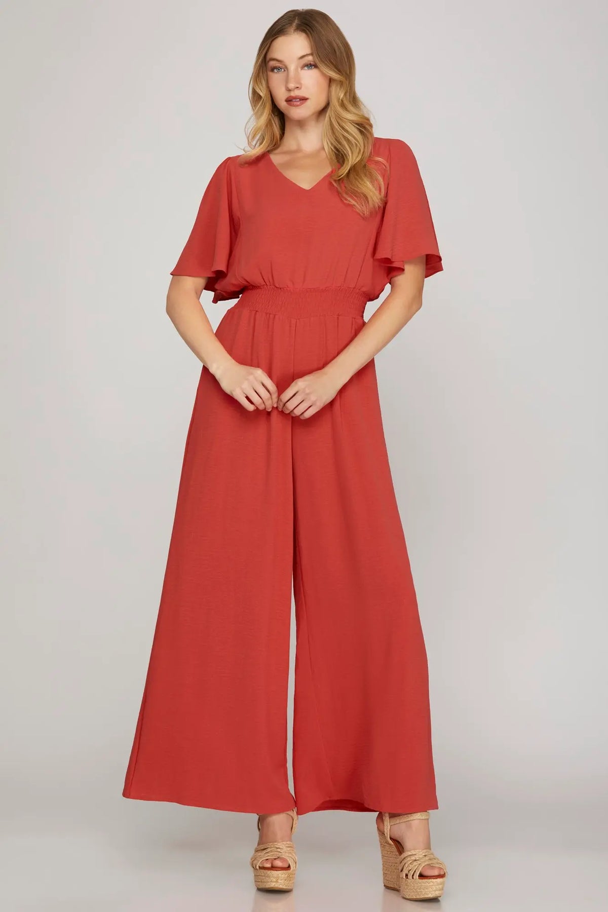 Meet the Mesa Sunset Jumpsuit — where comfort meets effortless elegance. This wide-leg beauty features a flattering smocked waist, flowy flutter sleeves, and a soft drape that moves beautifully with you.