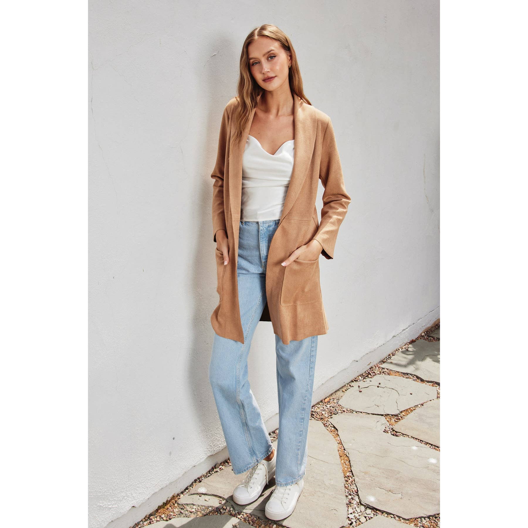 • Chic lapel + front pockets for that elevated finish