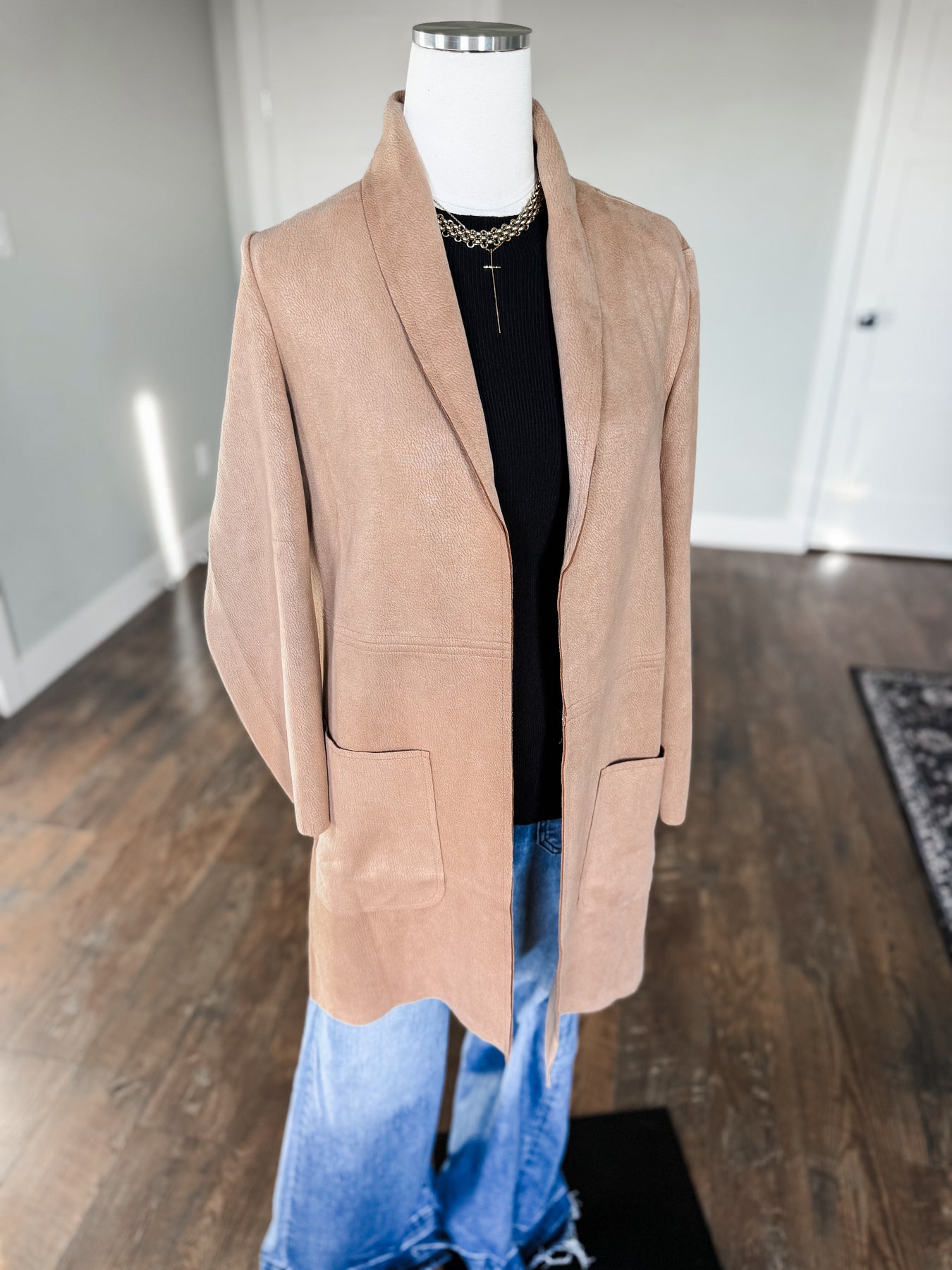 Elevate any outfit instantly with this gorgeous faux suede long coat — the definition of effortless winter chic. The longline silhouette is so on trend this season, giving you that polished, slimming look while still feeling soft, cozy, and easy to wear.