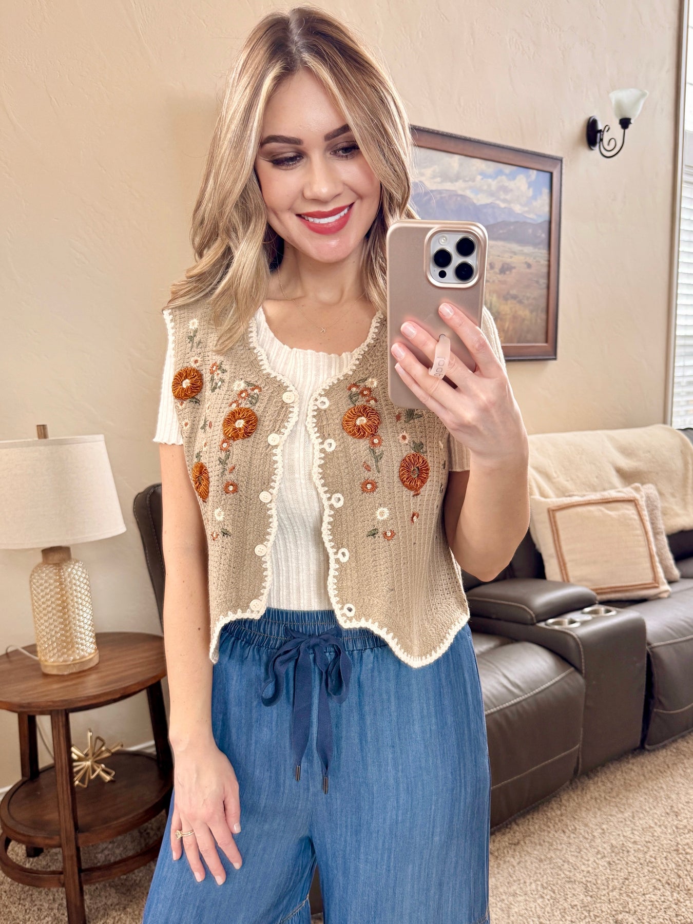 Embroidered Floral Crochet Vest In Mocha