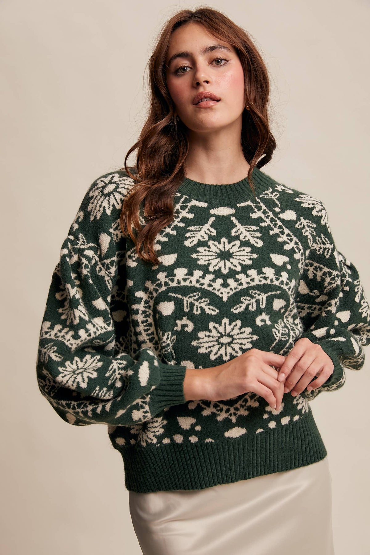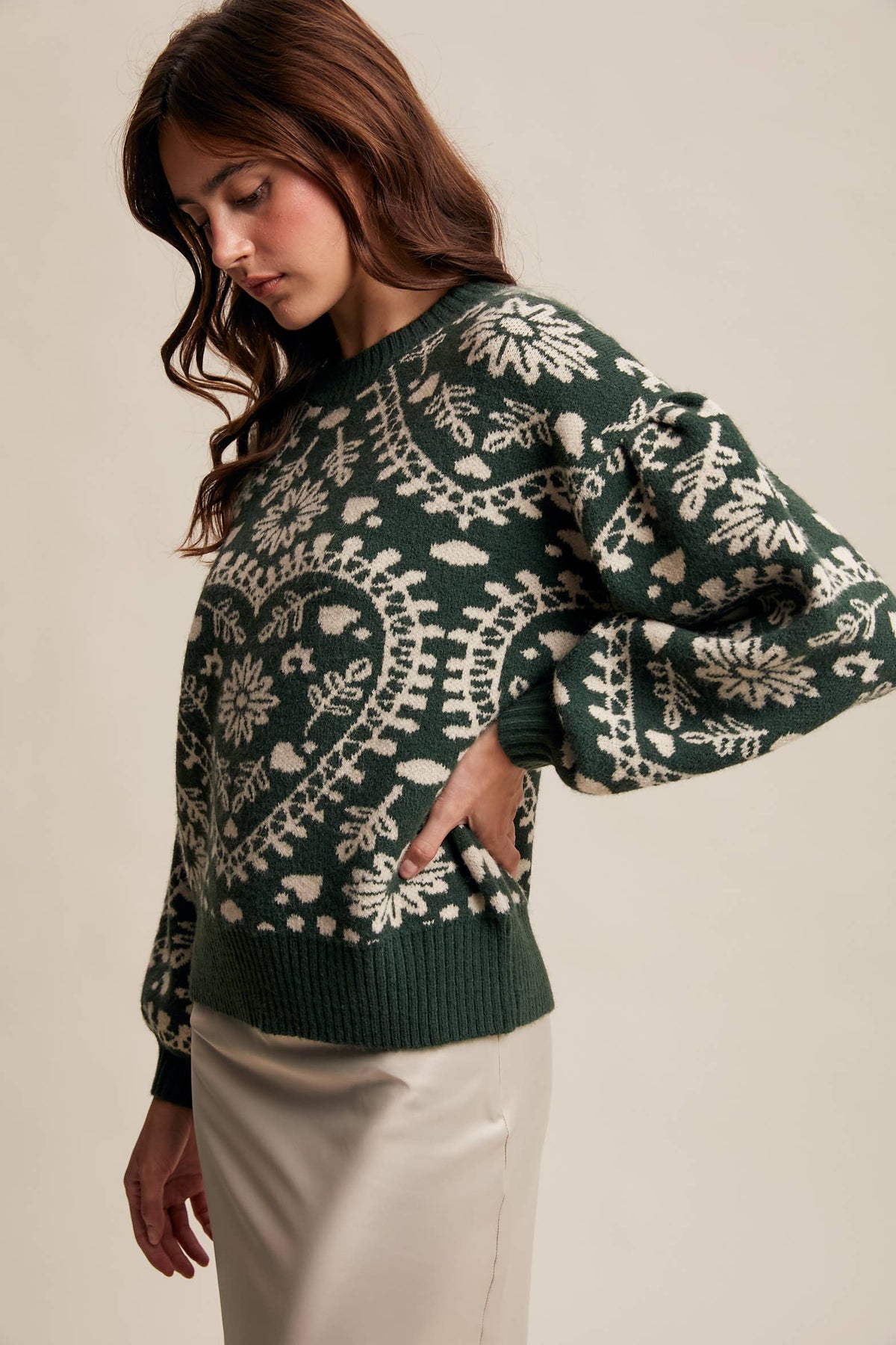Wrap yourself in warmth with this enchanting deep green sweater, featuring an adorable heart and floral jacquard design that brings a touch of romance to your everyday style. The mid-weight knit fabric feels incredibly soft against your skin, while the relaxed fit makes it perfect for layering through the cooler months. Ribbed crew neckline, gently ballooned sleeves, and a fitted hem create a polished silhouette that's both effortless and charming. The whimsical pattern flows seamlessly across the back, making this the ultimate cozy companion for those crisp autumn days when you want to feel both comfortable and utterly adorable.