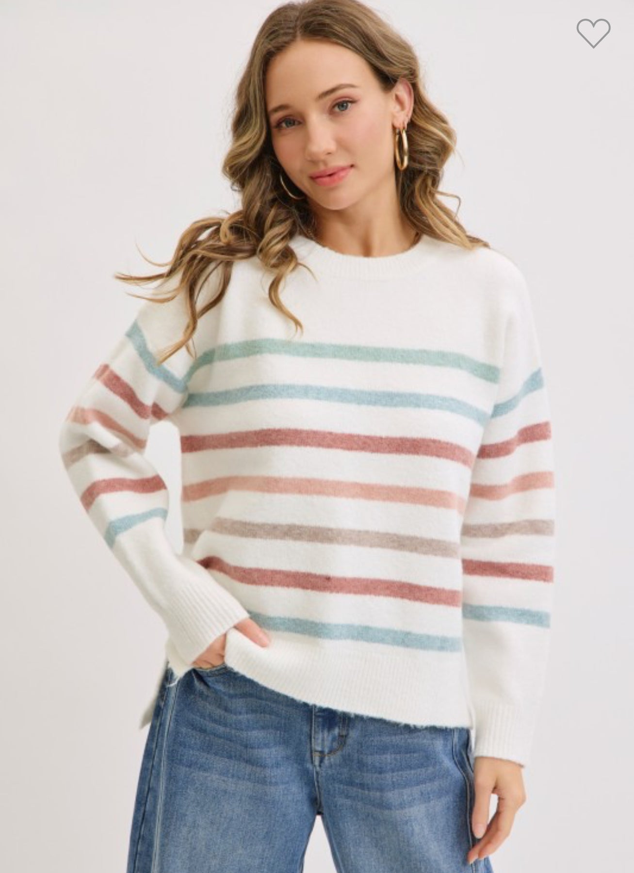 Soft, playful, and effortlessly cozy—the Painted Sky Striped Sweater is made for easy-going days with a touch of charm. Featuring a cream base with painterly stripes in muted teal, clay, blush, and taupe, this sweater feels like a sunrise over the desert horizon. The relaxed fit and side slits keep it comfortable and flattering, while the ribbed cuffs and hem add a classic finish.